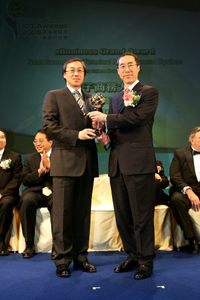Eric Ip, Managing Director of HIT (left) represents HIT on stage to receive the Grand Award in the eBusiness Category of the Hong Kong ICT Awards 2006 from Henry Tang, Financial Secretary of the HKSAR Government (right).